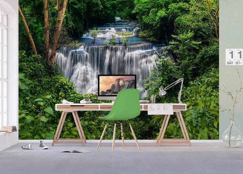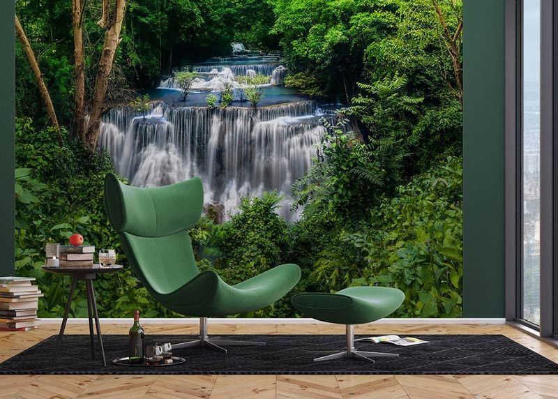 Ervaar de serene schoonheid van de Huai Mae Khamin-waterval met dit natuurgetrouwe fotobehang. Het kristalheldere water dat zich een weg baant door het groen brengt een rustgevende sfeer in de ruimte.