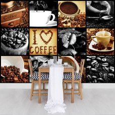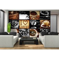Vlies fotobehang van een prachtige collage met daarin alles voor de koffieliefhebber. Dit fotobehang zorgt voor een unieke uitstraling in de: horecagelegenheid, keuken, woonkamer, slaapkamer, hal, kantoor, of iedere andere ruimte.