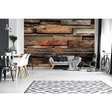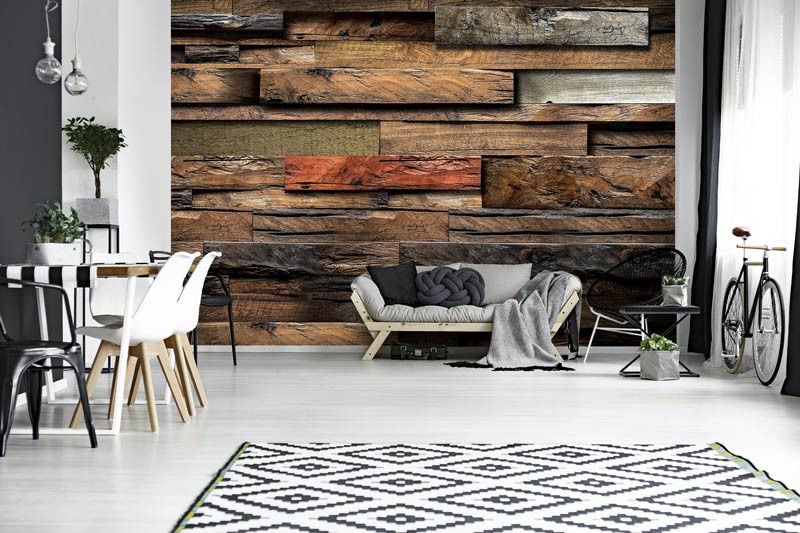 Het fotobehang van de verschillende industriële houten planken is een unieke aanvulling op elke ruimte.