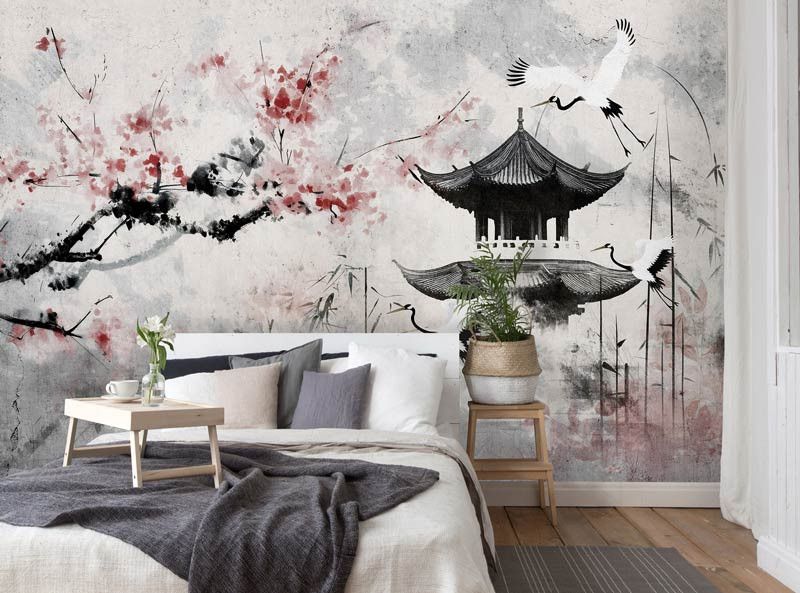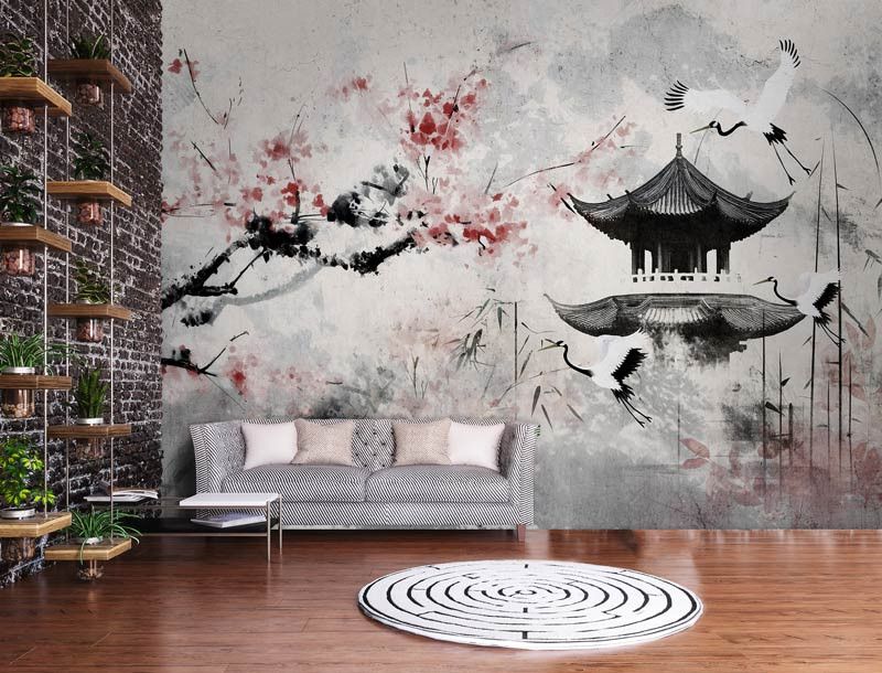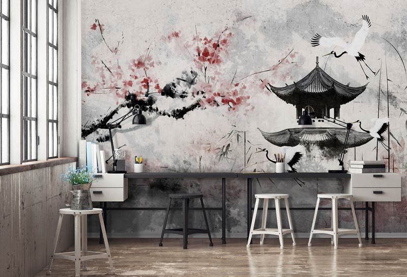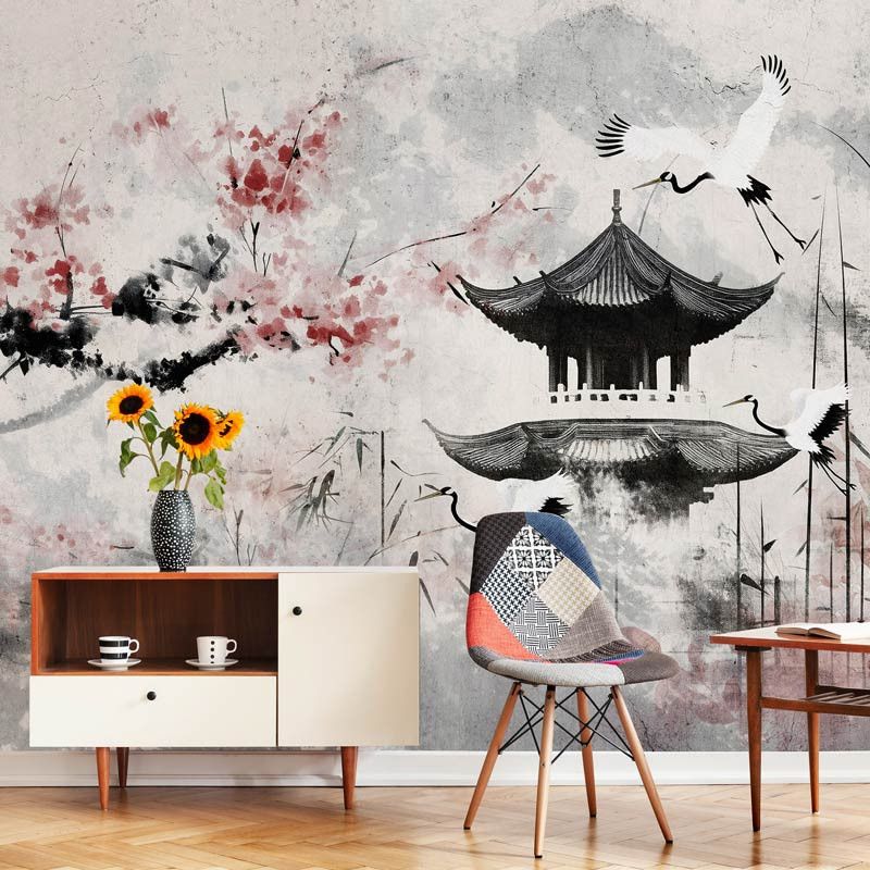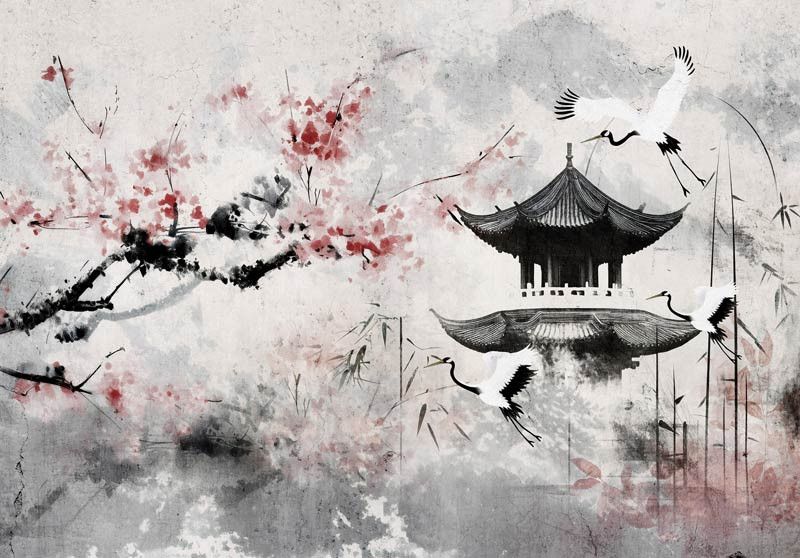 Fotobehang Japanse Kersenbloesem en Reigers in Kunststijl