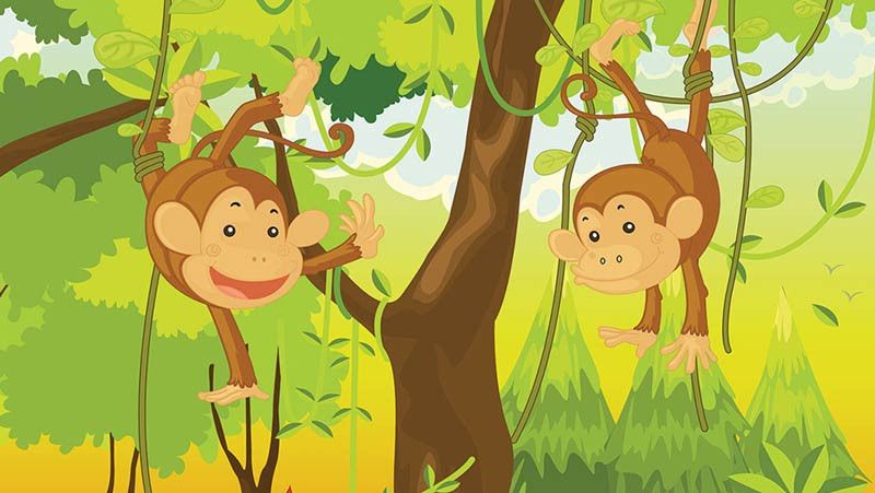 Fotobehang van vrolijke aapjes, zwaaiend aan een boom in de groene jungle.