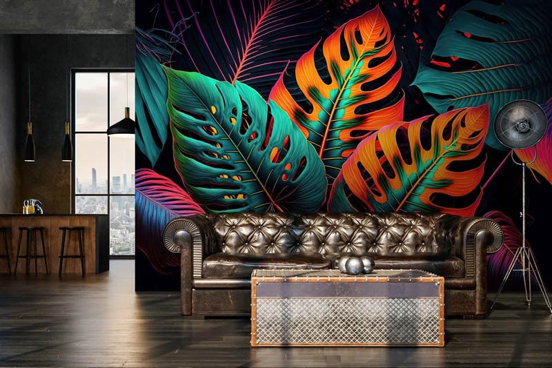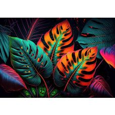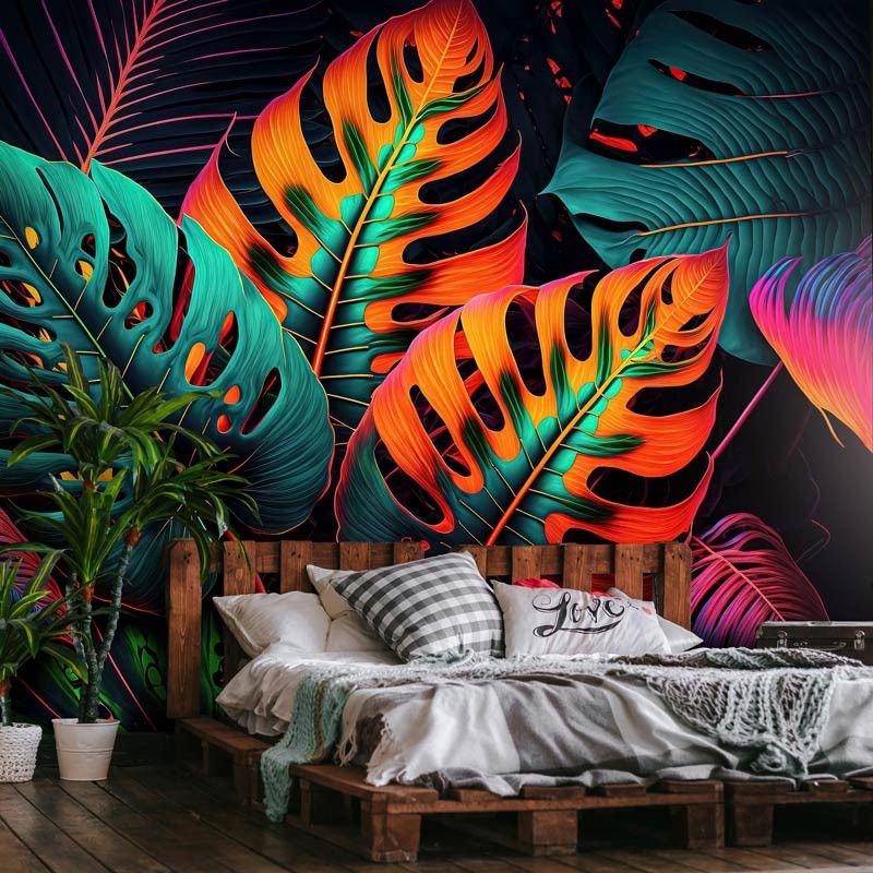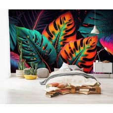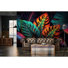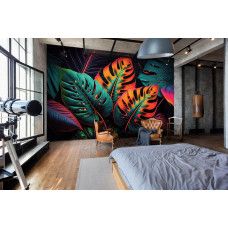 Haal de tropische sferen bij u binnen met het tropische bladeren neon fotobehang. De felgekleurde bladeren lijken te gloeien en brengen energie in iedere kamer.