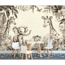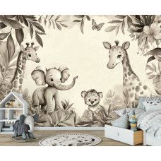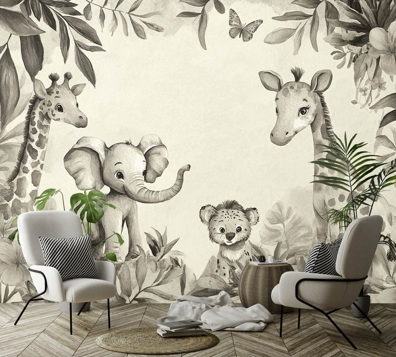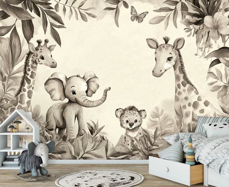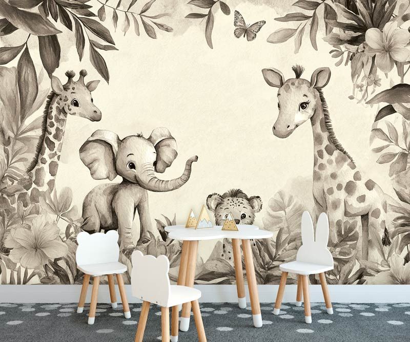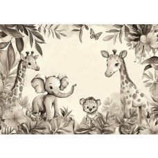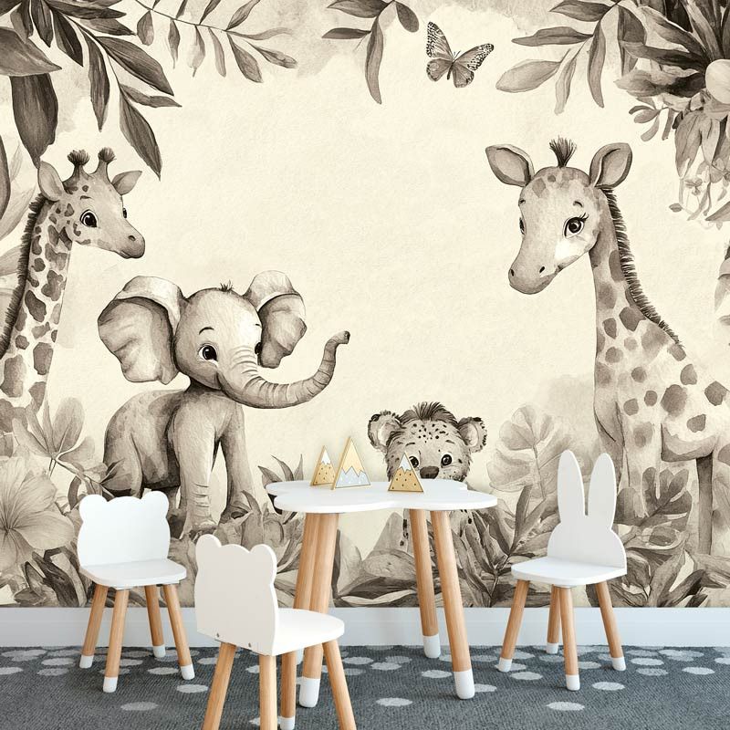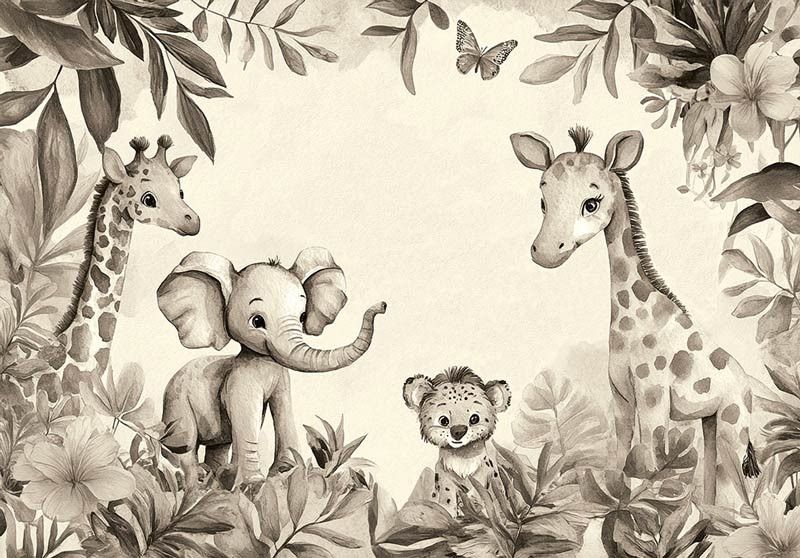 Breng een rustgevende junglesfeer in de kinderkamer met dit sfeervolle ontwerp in zachte taupe- en zandtinten. Een vriendelijke olifant, twee nieuwsgierige giraffen en een vrolijk welpje staan centraal tussen tropische bladeren, bloemen en een sierlijke vlinder – perfect voor een stijlvolle jongens- of meisjeskamer.