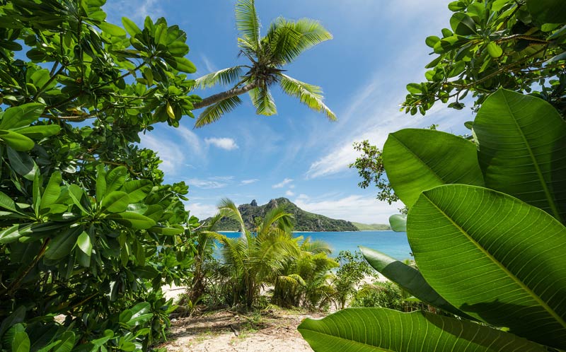 Het is heerlijk om tussen de tropische palmbladeren te zitten met uitzicht op de blauwe lagune.