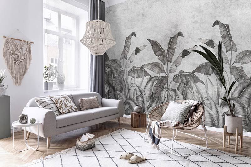 Breng de natuur in huis met ons fotobehang van jungle planten en bladeren op een betonnen muur, weergegeven in zwart-wit. Of je nu een modern interieur hebt of een meer klassieke inrichting, ons fotobehang van jungle planten en bladeren past perfect bij iedere stijl.