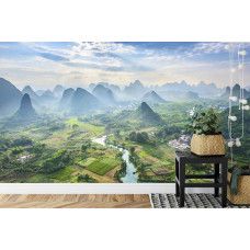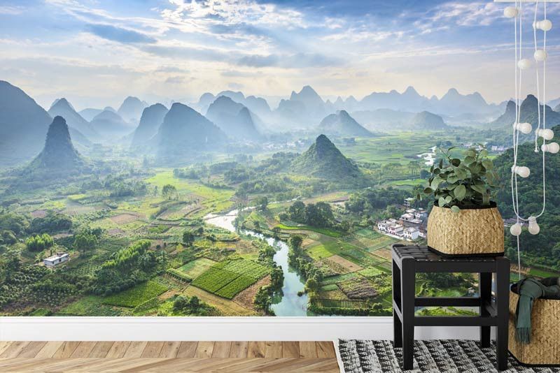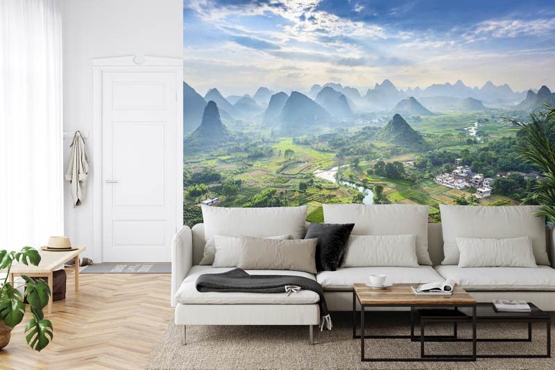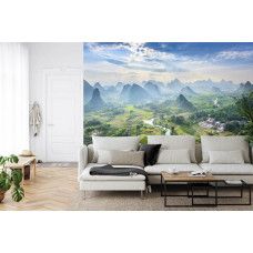 Duik in de sfeer van het pittoreske landschap met Fotobehang Karstgebergte in het dorpje Yangshuo. Verbeeld je de majestueuze karstformaties die oprijzen boven de traditionele gebouwen van het dorpje, en creëer een unieke ambiance in je interieur.