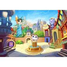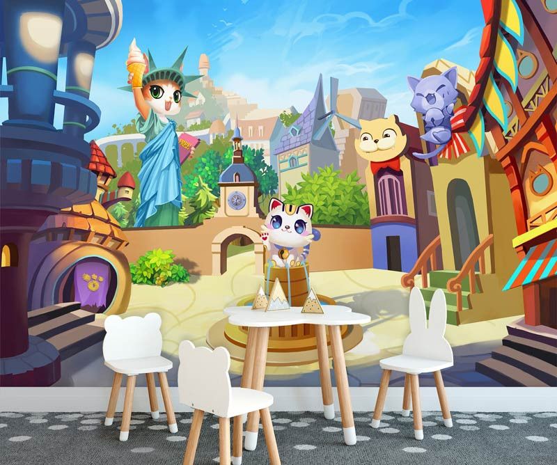 Fotobehang van een kleurrijk dorp met daarin schattige katten.