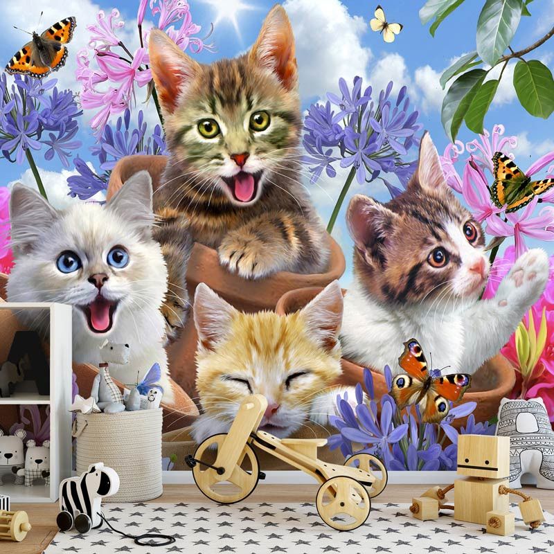 Vlies fotobehang van te gekke kittens, samen met een paar prachtige vlinders. Vrolijkt iedere kinderkamer helemaal op!