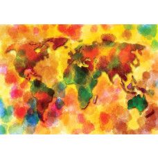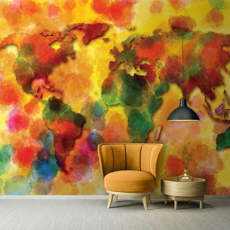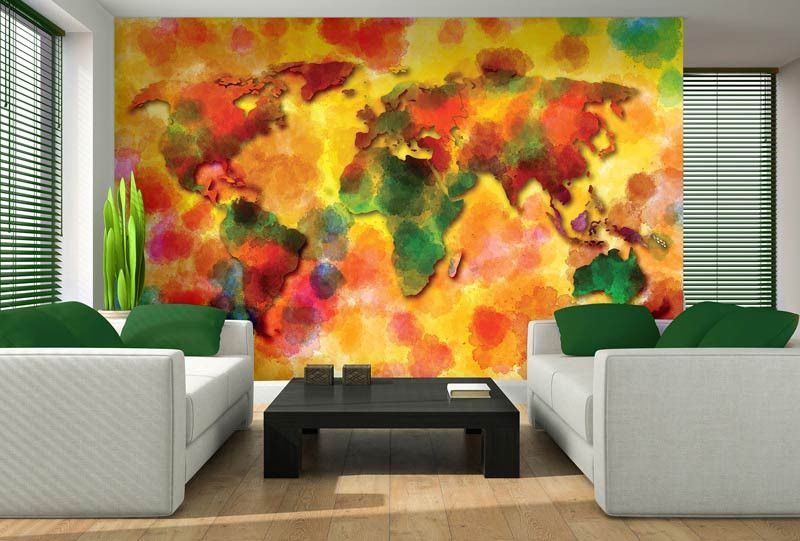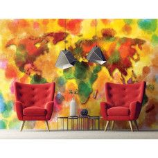 Vlies fotobehang van een geschilderd, abstract kunstwerk met daarop een kleurrijke wereldkaart.