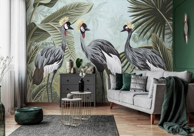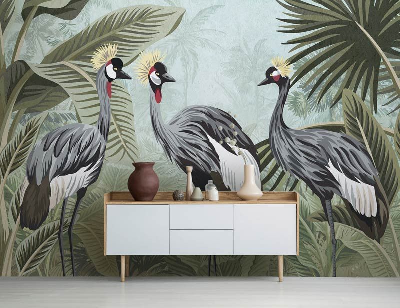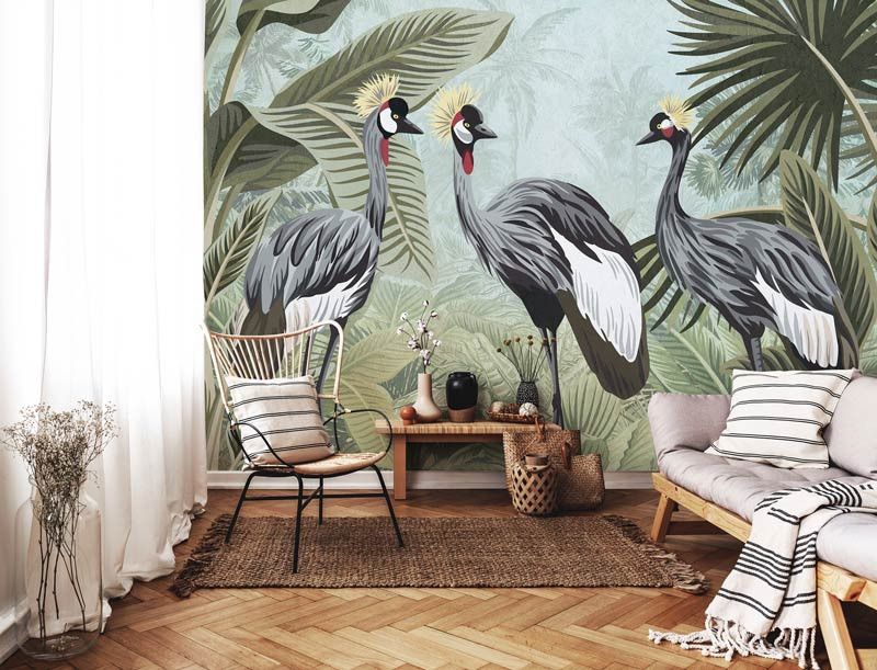 Haal de mystiek van de jungle naar je interieur met ons Fotobehang Kraanvogels in de Jungle. Dit betoverende fotobehang toont majestueuze kraanvogels te midden van weelderig groen, waardoor een sfeer van avontuur en natuurlijke schoonheid wordt gecreëerd in elke kamer.