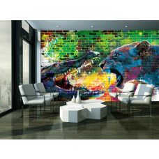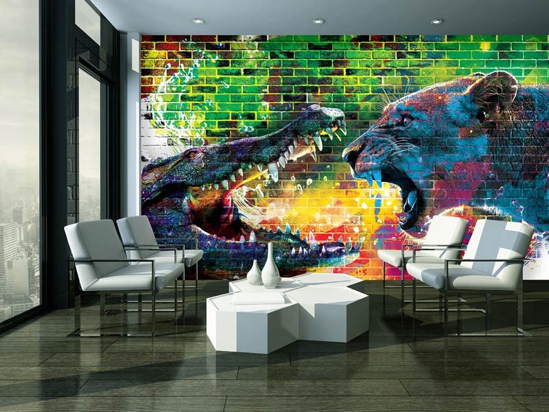 Fotobehang van een schitterende graffiti tekening met daarop een krokodil en een leeuwin die tegen elkaar strijden.