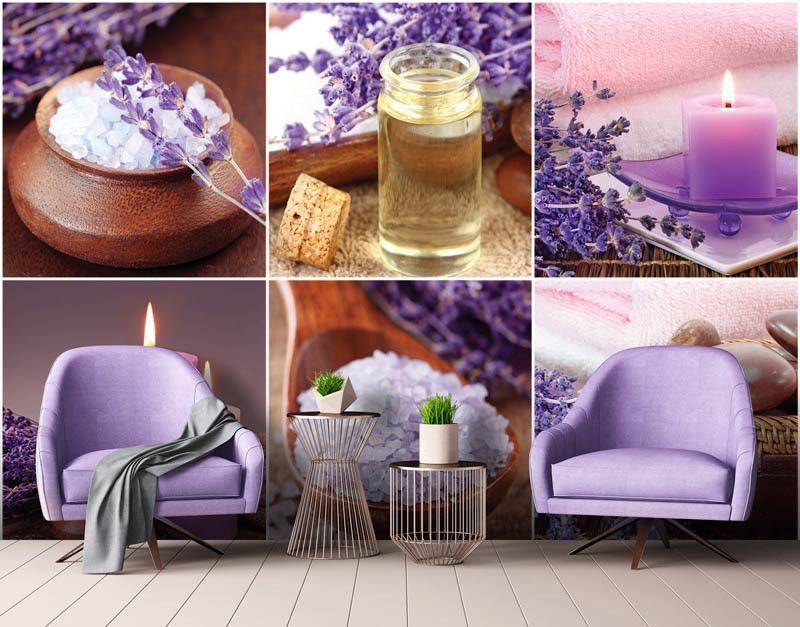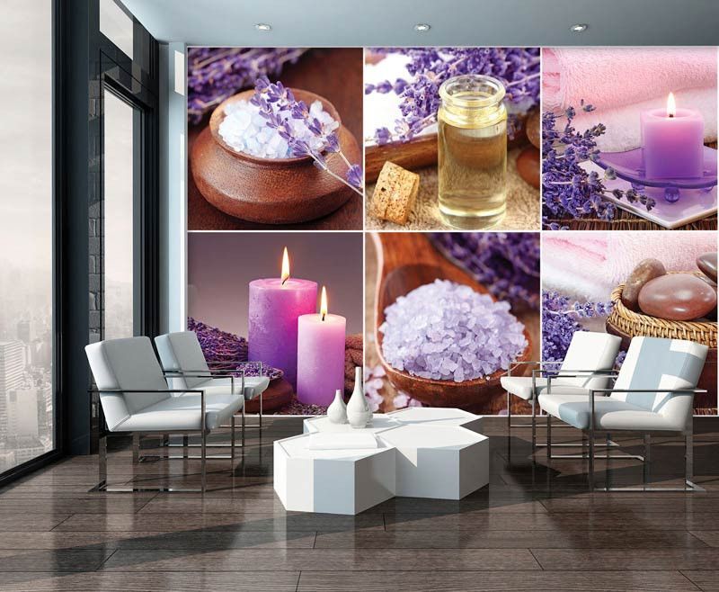 Vlies fotobehang van een collage vol met lavendel, kaarsen en meer.