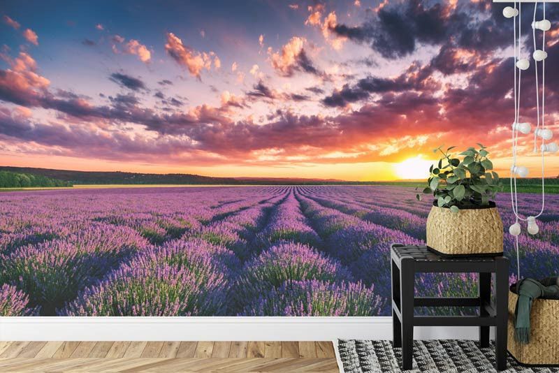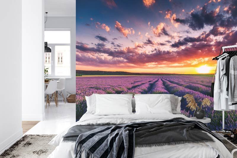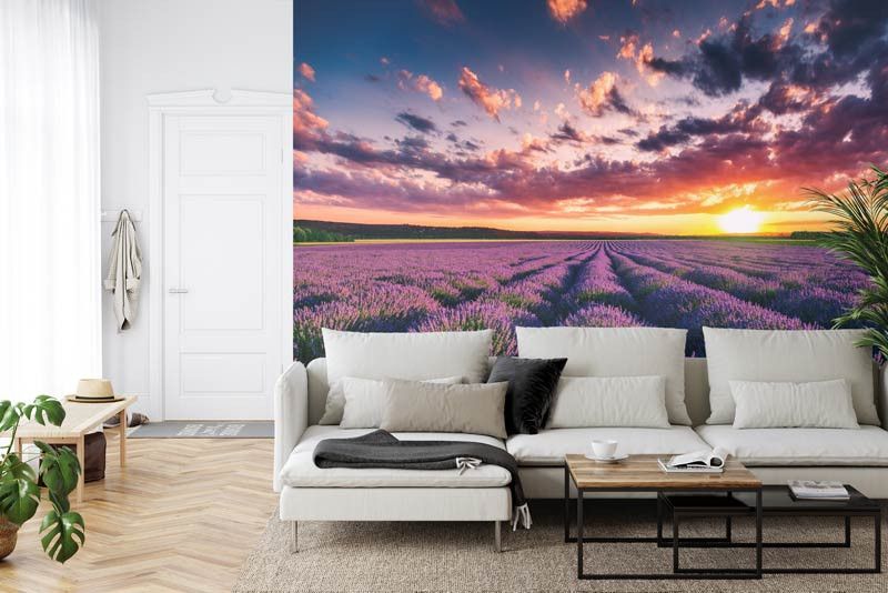 Met ons fotobehang kun je elke dag genieten van het adembenemende uitzicht op de ondergaande zon die de lavendelvelden in een warm licht baadt. Creëer een ontspannende oase in je huis of kantoor, waar je kunt wegdromen bij de rustgevende schoonheid van de natuur.
