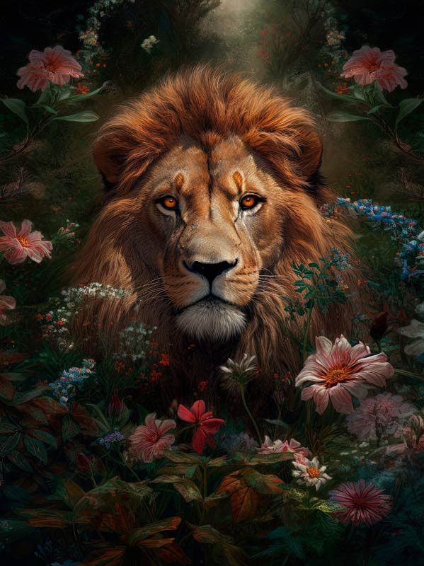 Ontwaak de koning van de jungle in je interieur met ons "Leeuw en Bloemen" fotobehang. Dit indrukwekkende ontwerp combineert de majestueuze uitstraling van een leeuwenkop met een sierlijke achtergrond van bloeiende bloemen. Het krachtige beeld van de leeuw, gedetailleerd en levensecht, wordt verzacht door de delicate bloemen die het omringen, wat zorgt voor een unieke harmonie in elke ruimte.
