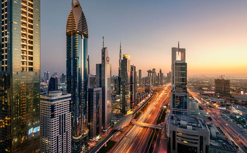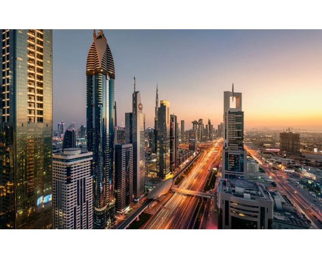 Het uitzicht vanaf de 43e verdieping van de stad in het avondlicht.