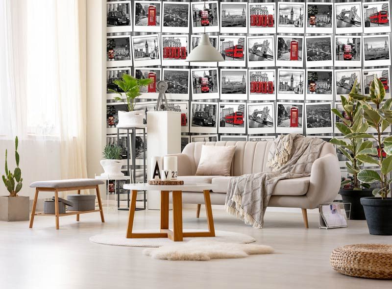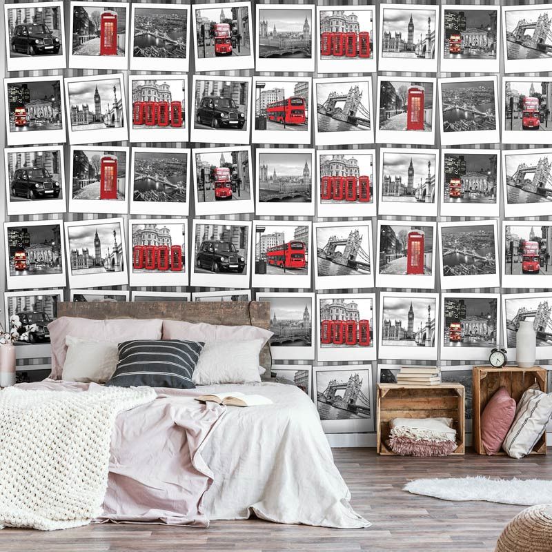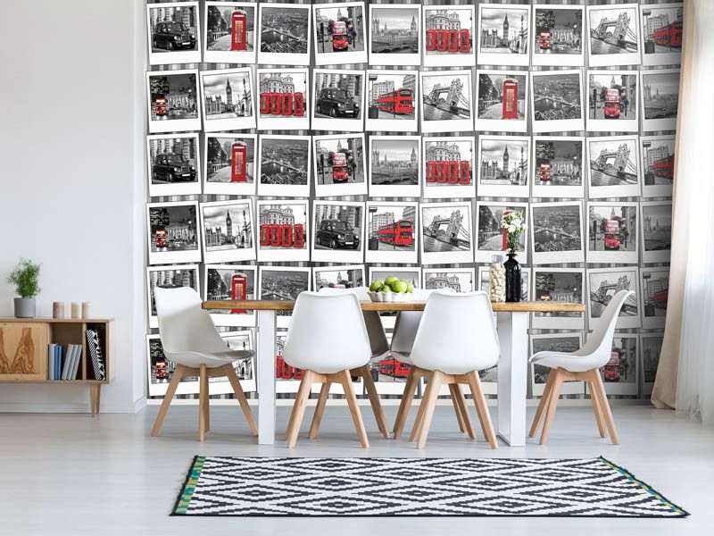 Vliesbehang van een fotocollage van de: Big Ben, Tower Bridge, rode dubbel dekker en alles wat met de hoofdstad van Engeland te maken heeft.