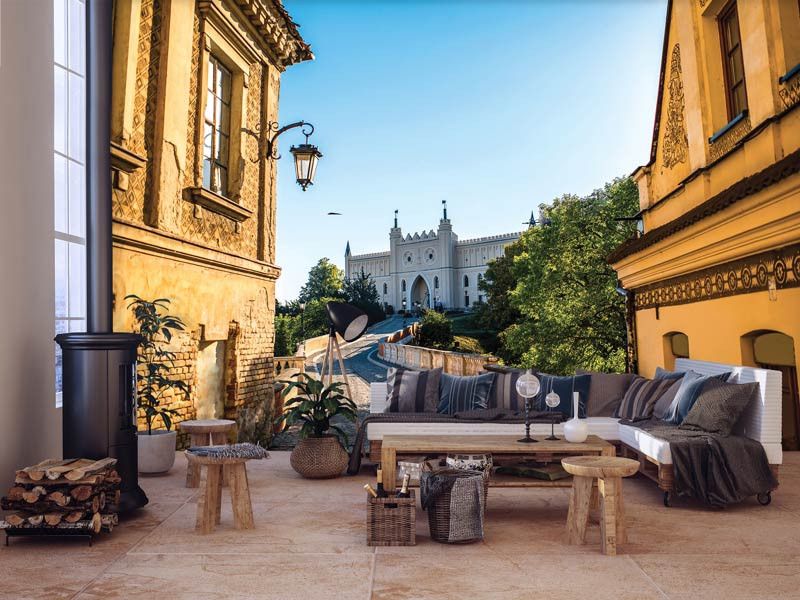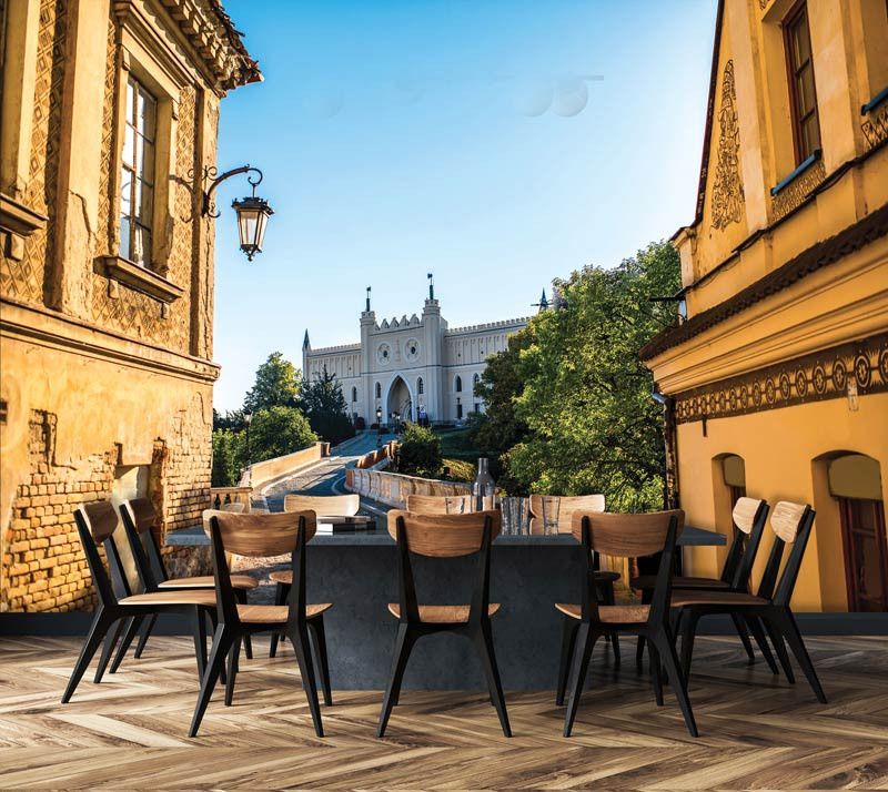 Vliesbehang met daarop het uitzicht op een straat in Lublin die naar een monument van de Poolse stad loopt. De diepte van deze foto zorgt voor een geweldig 3D effect.