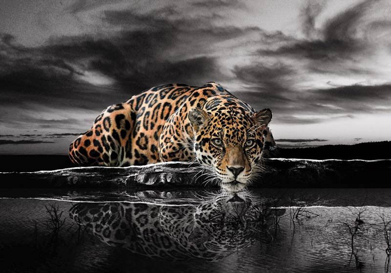 Het luipaard in kleur en de achtergrond in zwart-wit zorgen voor een mooi contrast.