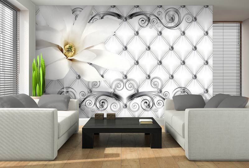 Vlies fotobehang van een prachtig, zilveren patroon, gecombineerd met een mooie, witte bloem.