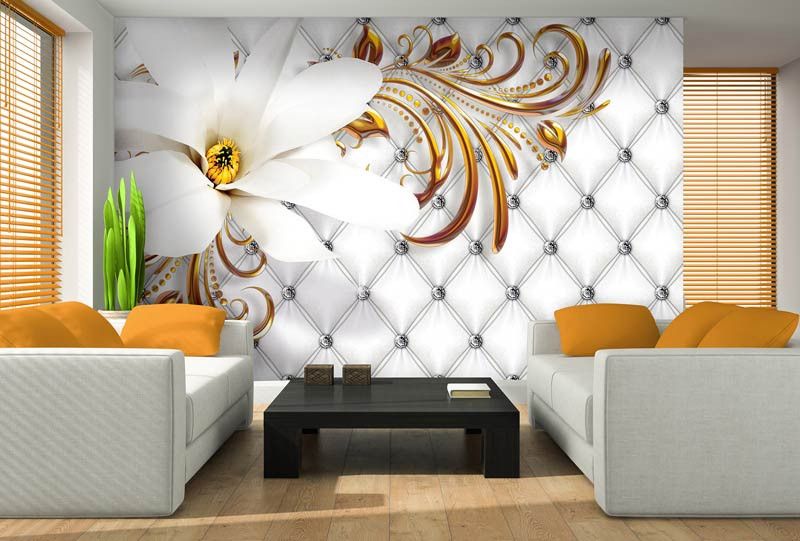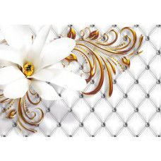 Vlies fotobehang van een prachtig, zilveren en gouden patroon, gecombineerd met een mooie, witte bloem.