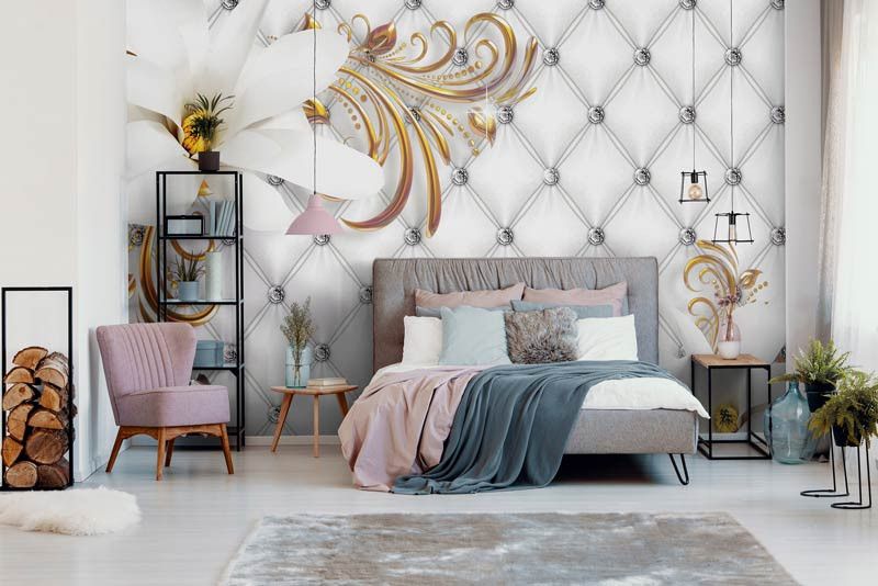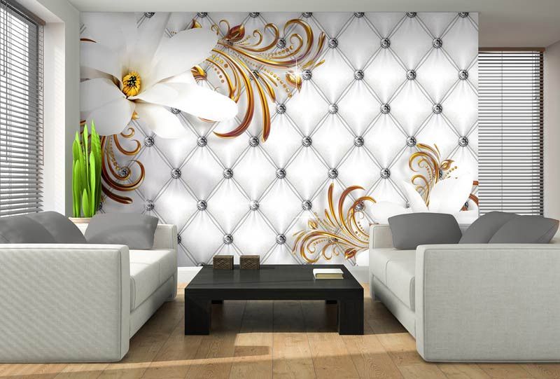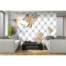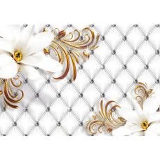 Vlies fotobehang van een prachtig, zilveren en gouden patroon, gecombineerd met mooie, witte bloemen.