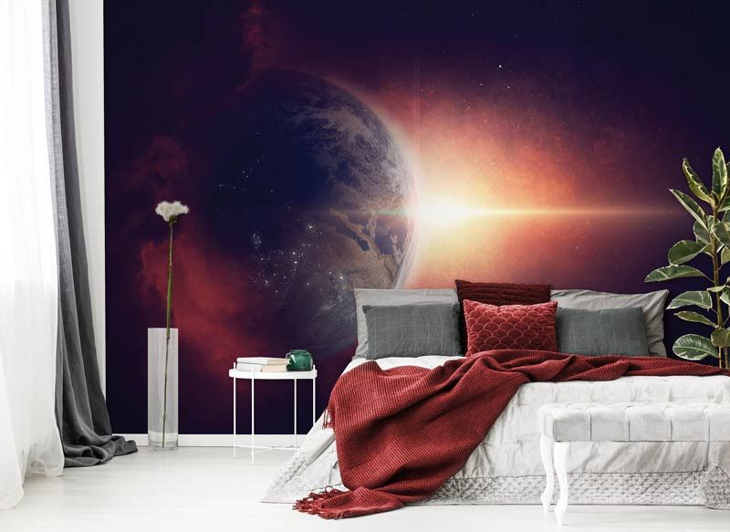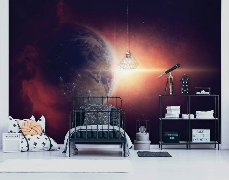 Met het fotobehang van de planeet aarde vanuit de ruimte gezien, kunt u uw kamer omtoveren tot een prachtig universum. Het behang geeft een realistische weergave van onze wereldbol met zijn blauwe oceanen, groene bossen en bruine continenten.