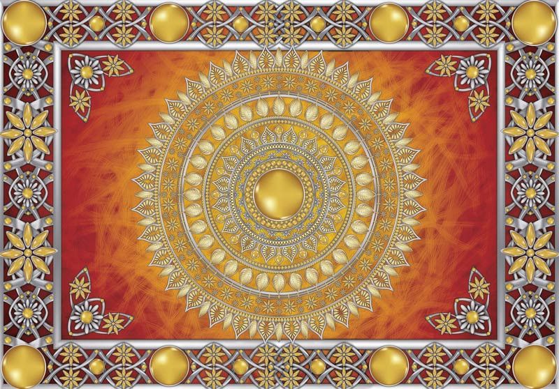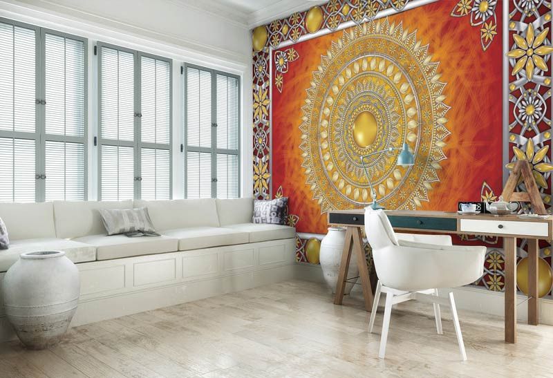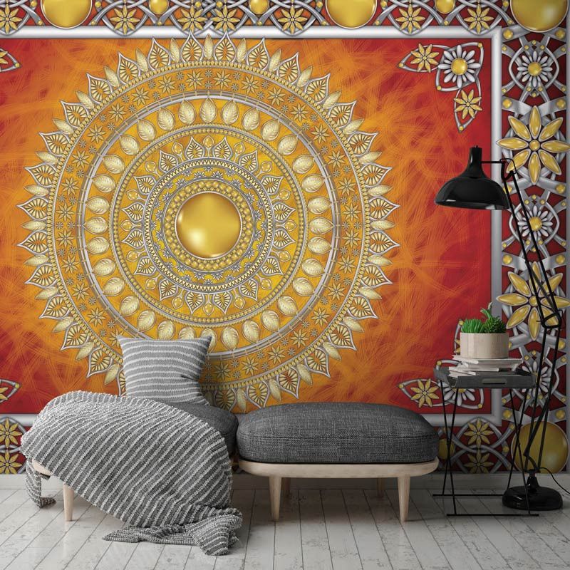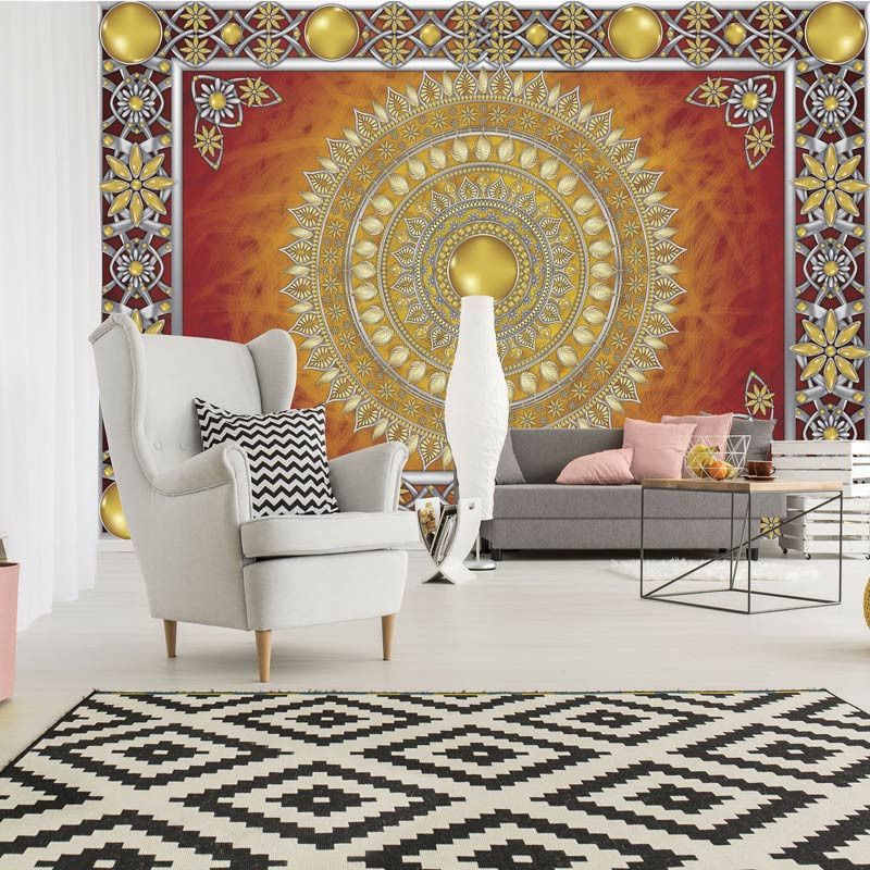 Vlies fotobehang van een gouden mandala op een rode achtergrond. De mandala is een plan, kaart of geometrisch patroon dat metafysisch of symbolisch de kosmos uitbeeldt in de Tibetaanse kunst en het Tibetaans boeddhisme.