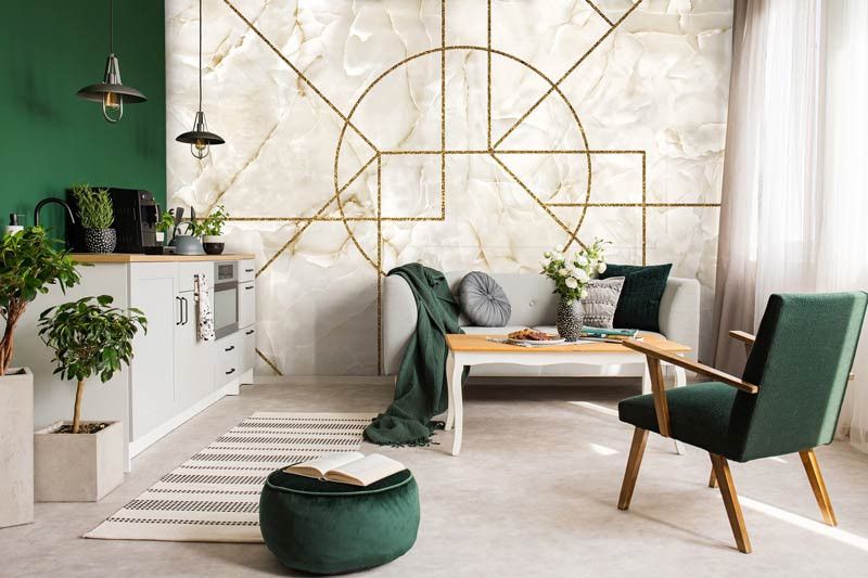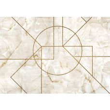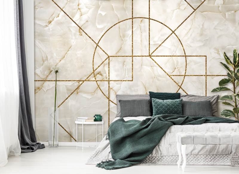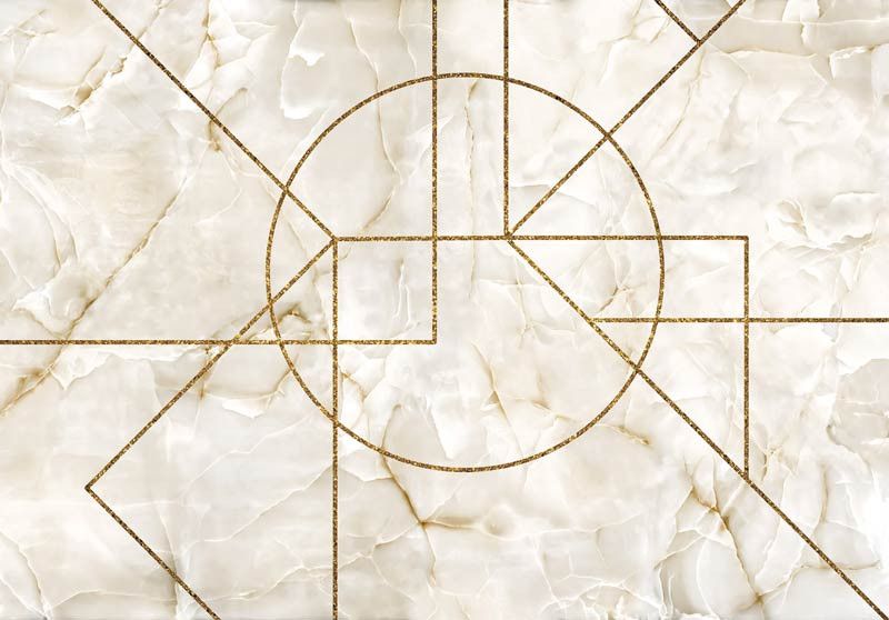 Fotobehang van een marmeren muur met gouden geometrische versiering. Marmer fotobehang is tegenwoordig erg populair omdat het nauwelijks van echt marmer te onderscheiden is.