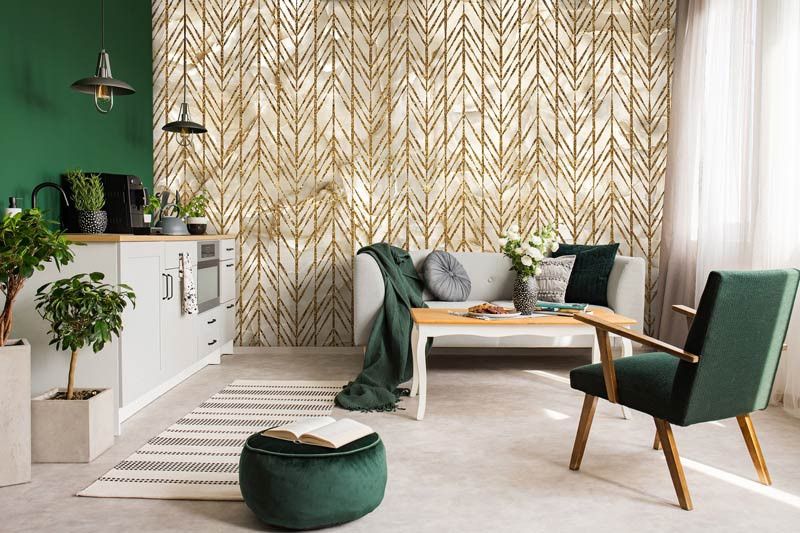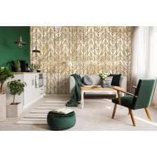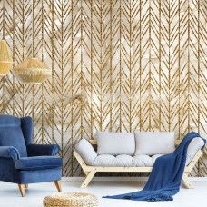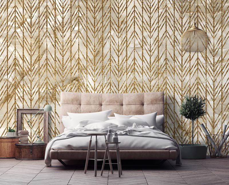 Fotobehang van een marmeren muur met gouden versieringen. Marmer fotobehang is tegenwoordig erg populair omdat het nauwelijks van echt marmer te onderscheiden is.