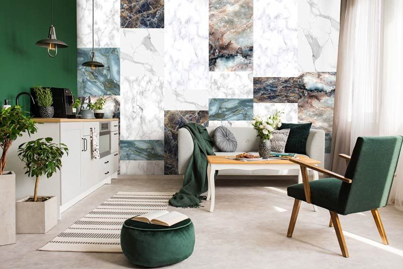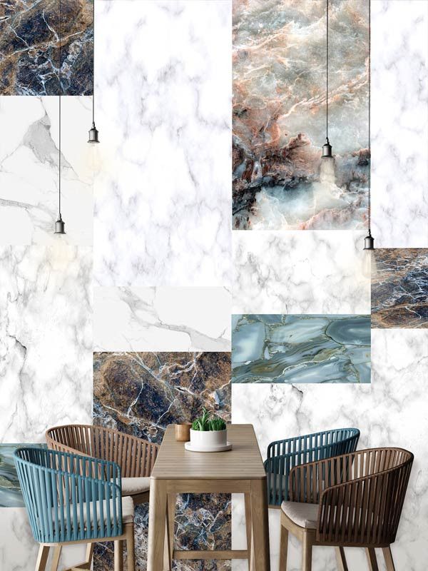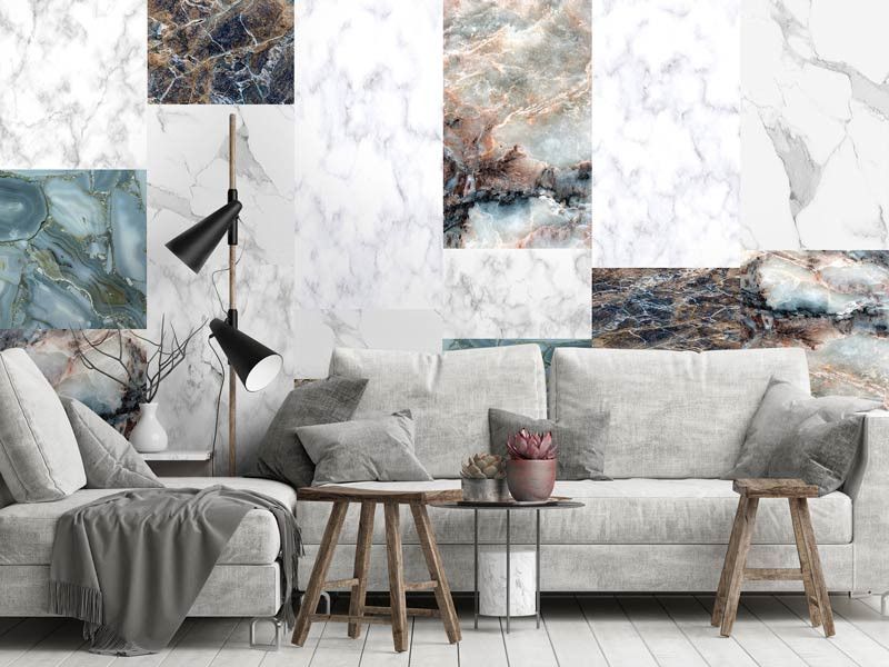 Het marmeren fotobehang is een echte eyecatcher en zorgt voor een industriële uitstraling in de woonkamer, slaapkamer of iedere andere ruimte.