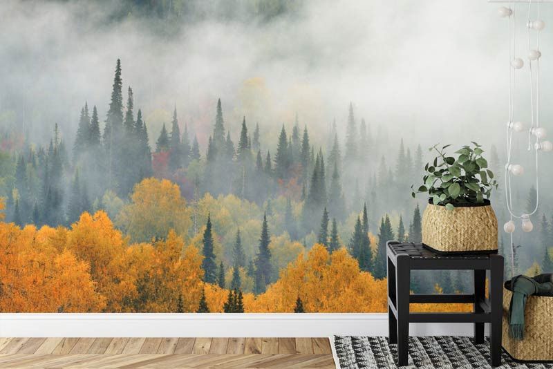 Laat je betoveren door de betoverende pracht van Fotobehang Mist Boven het Herfstbos. Ervaar de mysterieuze sfeer van een herfstig bos gehuld in nevel, waar de bomen gehuld zijn in warme herfstkleuren en de ochtendmist zachtjes over de grond zweeft.