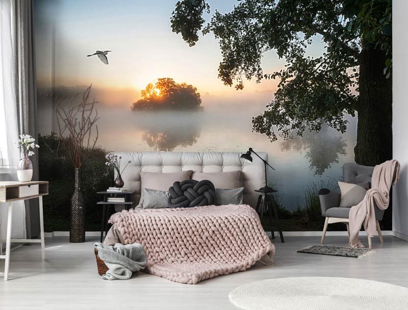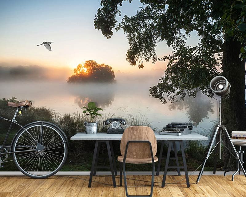 Met dit prachtige fotobehang met een mistig landschap en een meer haal je de rustgevende sfeer van de natuur in huis. Het behang toont een serene omgeving waarin de mist langzaam optrekt en het meer zachtjes rimpelt. Het is alsof je vanuit je eigen huis uitkijkt op een idyllisch uitzicht.