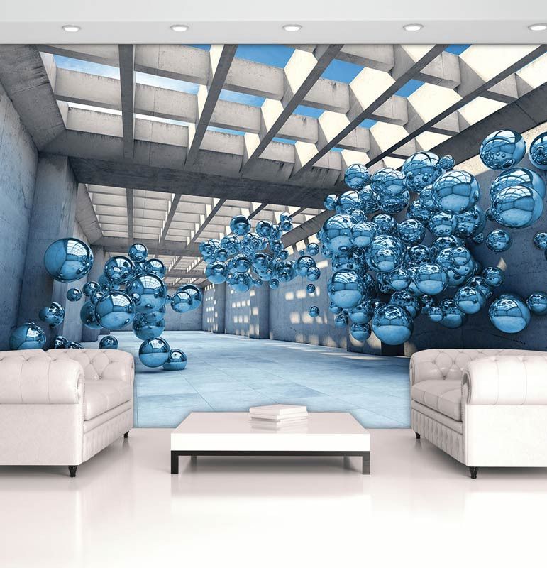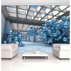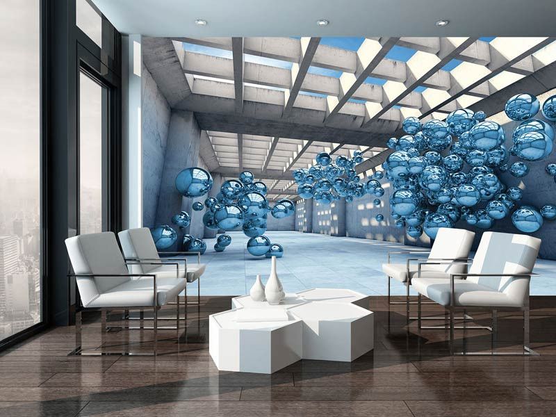 Vlies fotobehang van blauwe metalen ballen in een abstracte 3D ruimte.