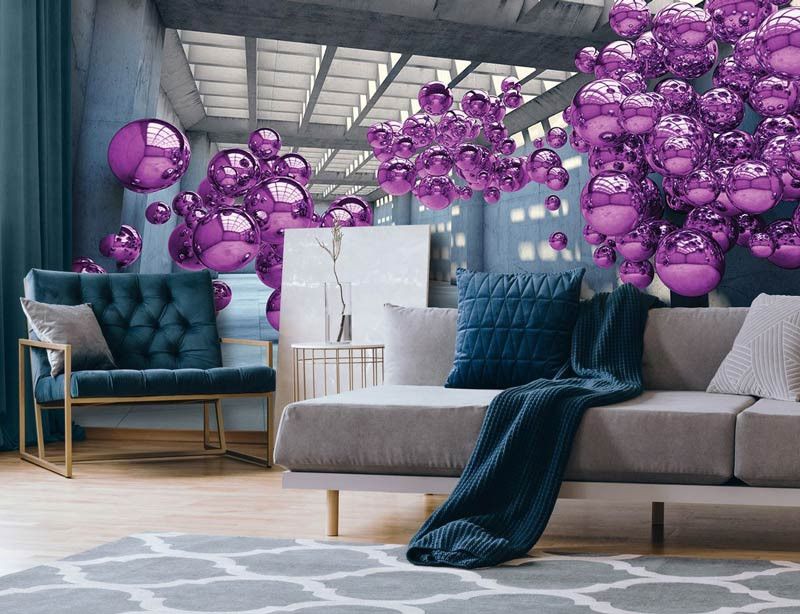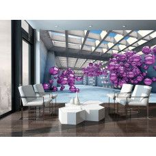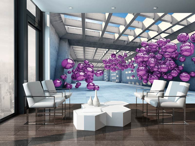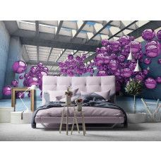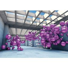 Vlies fotobehang van paarse metalen ballen in een abstracte 3D ruimte.
