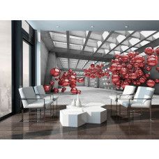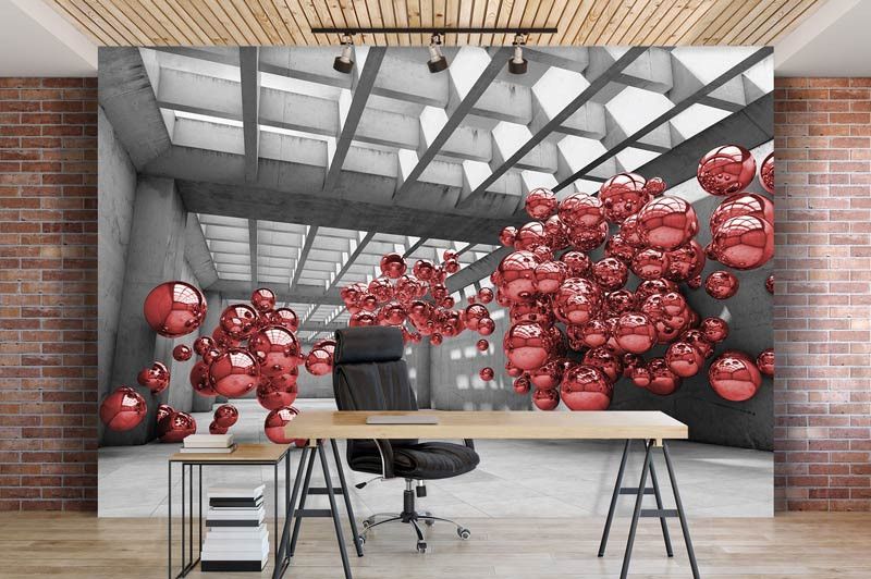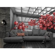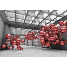 Vlies fotobehang van rode metalen ballen in een abstracte 3D ruimte.