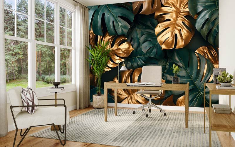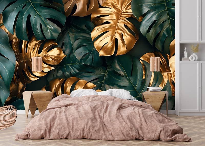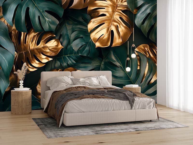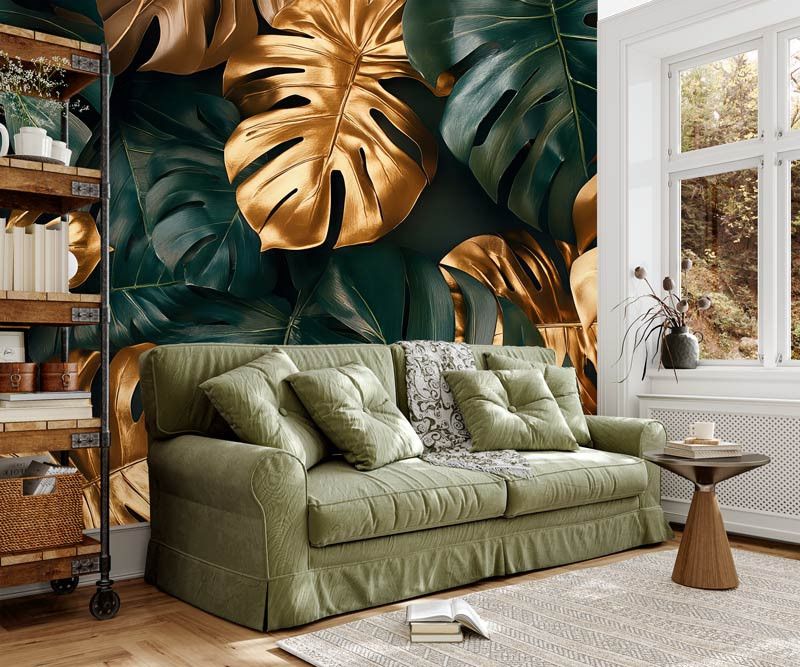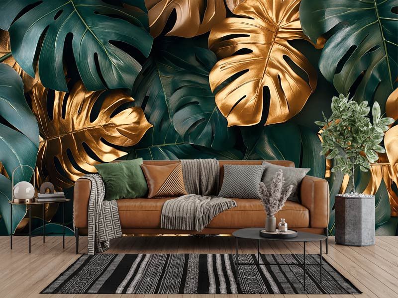 Het fotobehang Monstera Bladeren in Groen en Goud brengt sfeer en diepte in de ruimte. Perfect voor de woonkamer, slaapkamer of kantoor, waar het een chique en natuurlijke ambiance creëert met een exclusieve uitstraling.