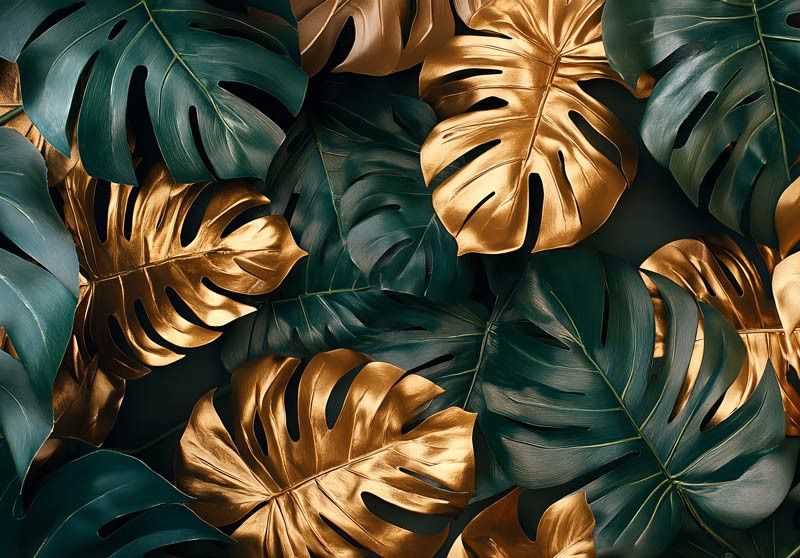 Geef je interieur een luxe en botanische uitstraling met het fotobehang Monstera Bladeren in Groen en Goud. Dit stijlvolle ontwerp toont grote monstera bladeren in diepe groentinten, gecombineerd met warme goudaccenten. De rijke kleuren en verfijnde details zorgen voor een elegant en modern geheel.