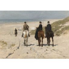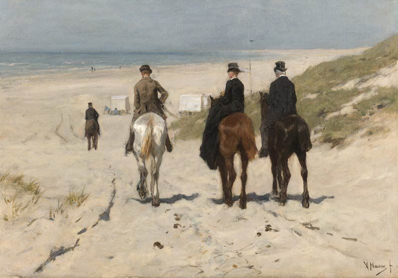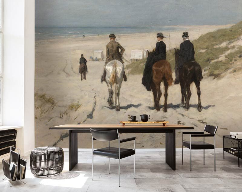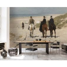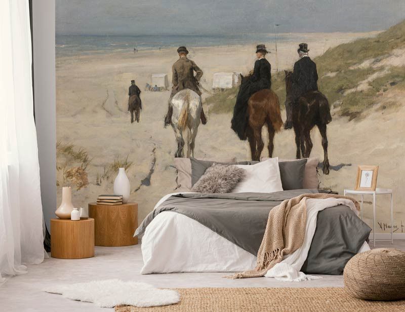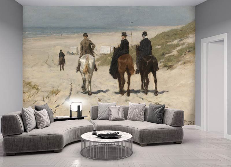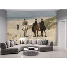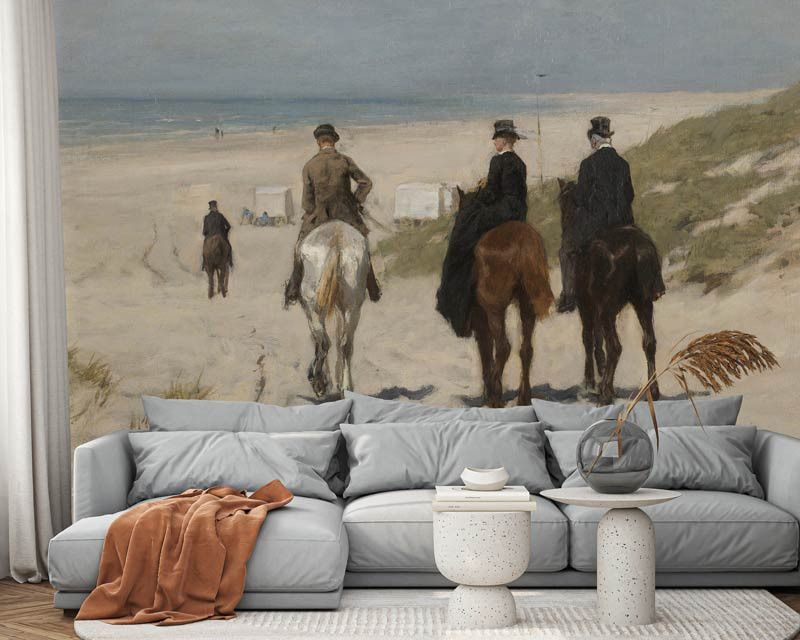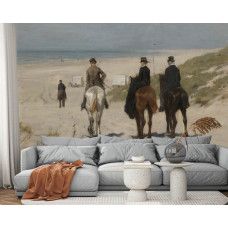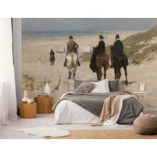 Breng de serene schoonheid van een zomerse ochtend aan zee naar je interieur met het Fotobehang Morgenrit langs het Strand. Gebaseerd op het iconische schilderij van Anton Mauve (1838–1888), toont dit fotobehang drie ruiters te paard die afdalend naar het strand een moment van rust en elegantie vastleggen. De badkoetsjes en de zacht glooiende duinen scheppen een sfeer van luxe en ontspanning, die perfect past bij de woonkamer, slaapkamer of studeerkamer.