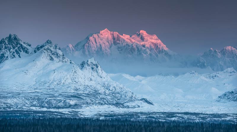 IJzige bergwerelden zijn te vinden in de Alaska Range: de indrukwekkende Mount Stevens domineert majestueus de ijzige vlakte.