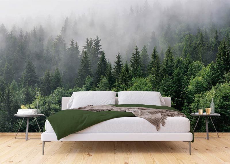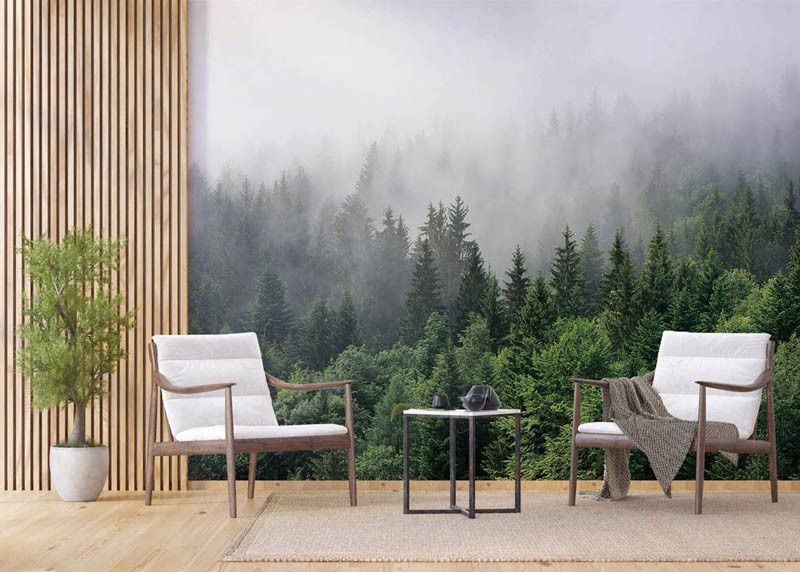 Ervaar de mystieke sfeer van een bergbos gehuld in mist. De zachte grijstinten en schaduwen creëren een serene, bijna magische uitstraling. Dit op maat te bestellen fotobehang brengt rust en elegantie in elke ruimte en is perfect voor ontspanningsruimtes en slaapkamers.