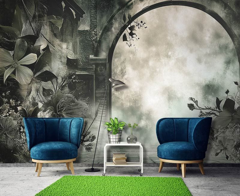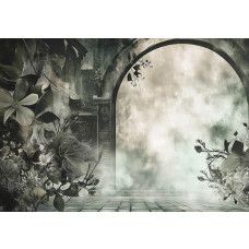 Ontdek een verborgen wereld vol charme en mysterie met het fotobehang van een oude ruïne omringd door weelderige bloemen. Dit betoverende ontwerp toont een aantal mooie bloemen en een mysterieuze poort die omringt is met mist. Een sfeervol tafereel waarin verleden en natuur samenkomen.