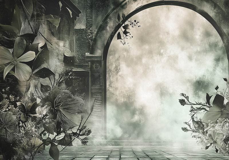 De combinatie van de romantische bloemen, het verweerde steenwerk en de dromerige nevel zorgt voor een zachte, poëtische uitstraling. Deze muurdecoratie brengt rust en karakter in je interieur, en nodigt uit tot wegdromen naar verre oorden en verloren tijden.