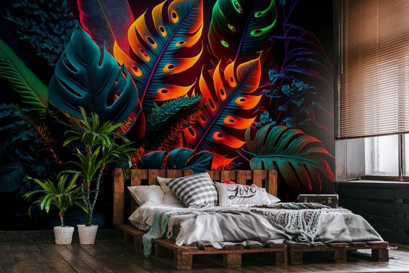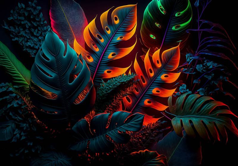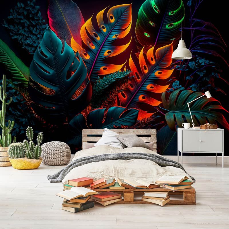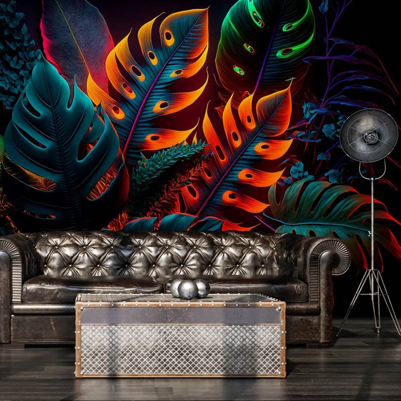 Fotobehang met daarop tropische, jungle bladeren in neonkleuren. De felgekleurde bladeren lijken te gloeien en brengen energie in iedere ruimte.