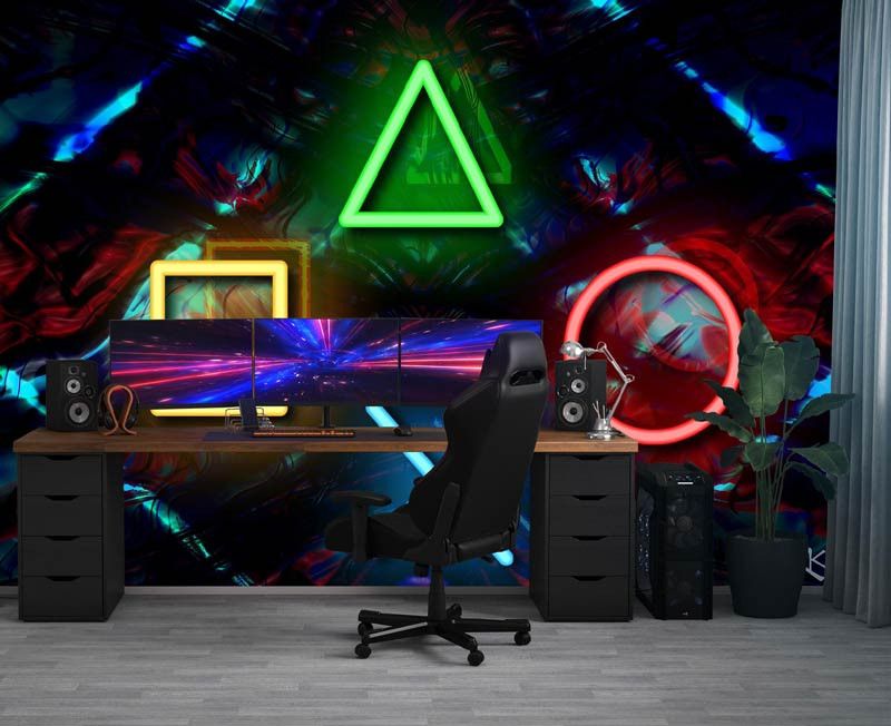 Geef je gamekamer een indrukwekkende upgrade met het stoere Fotobehang Neon PlayStation Symbolen. Dit krachtige ontwerp toont de iconische PlayStation-symbolen – driehoek, vierkant, kruis en cirkel – in fel oplichtende neonkleuren tegen een donkere, futuristische achtergrond. De combinatie van diepte, kleur en licht creëert een dynamisch effect dat perfect past bij een moderne gamersruimte.