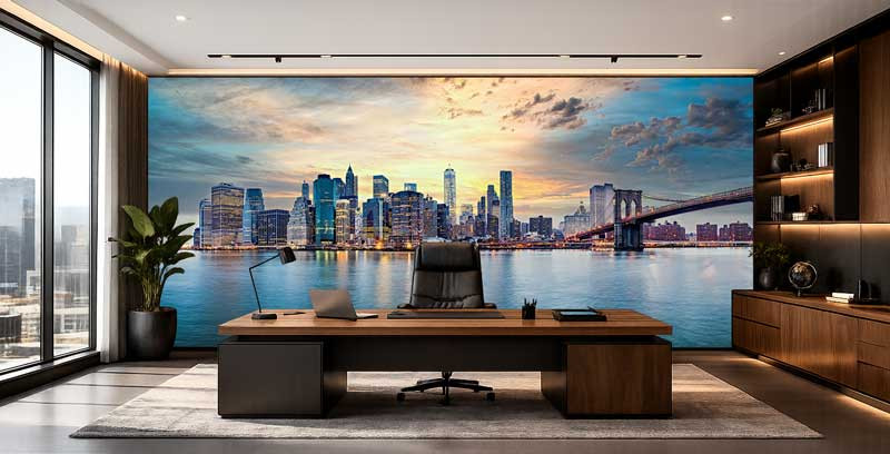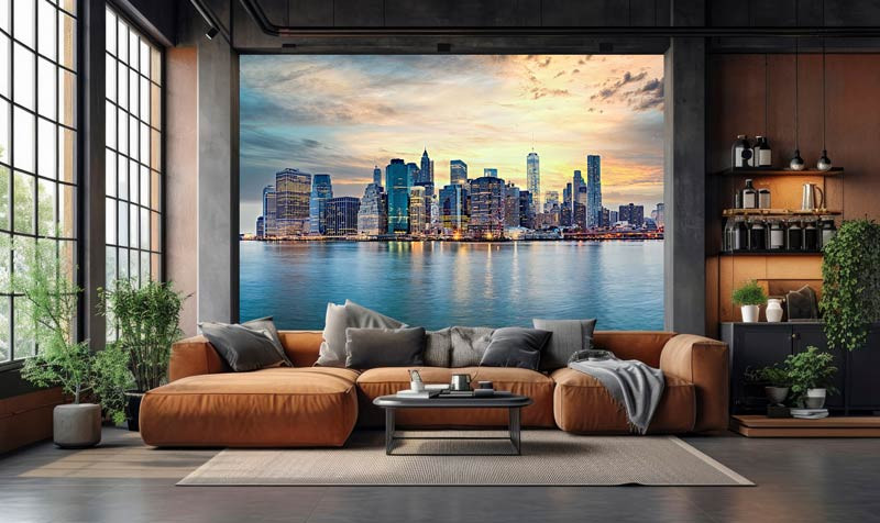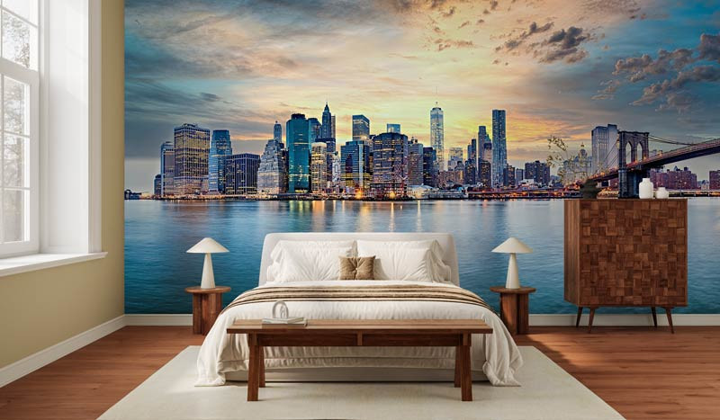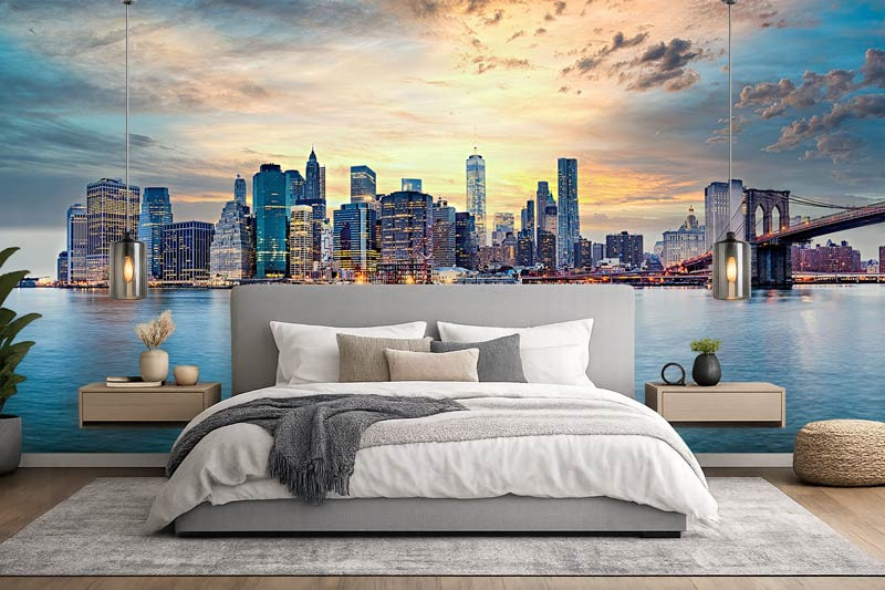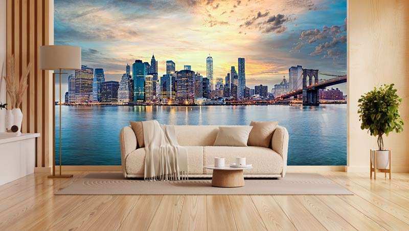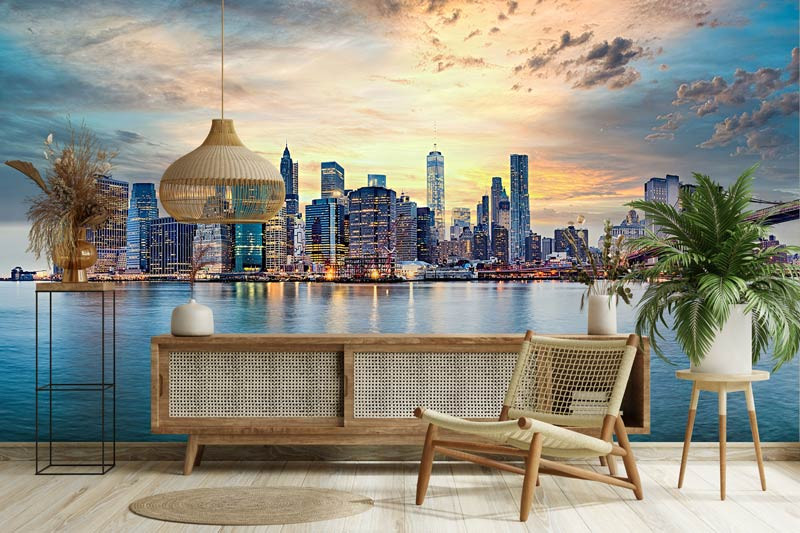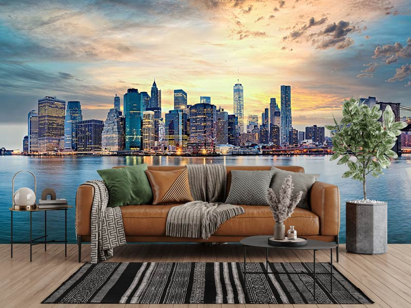 Dit indrukwekkende fotobehang toont de iconische skyline van New York tijdens een sfeervolle zonsondergang. De warme oranje en gouden tinten in de lucht contrasteren prachtig met de koele blauwe reflecties in het water. De bekende wolkenkrabbers en de Brooklyn Bridge creëren samen een dynamisch en modern stadsbeeld met een breed panoramisch effect.
