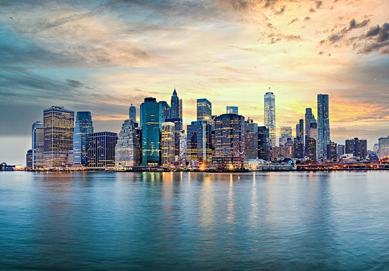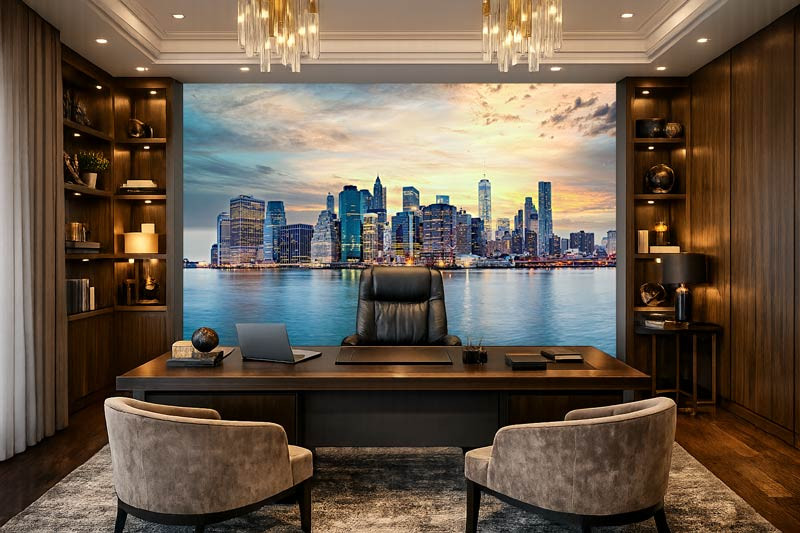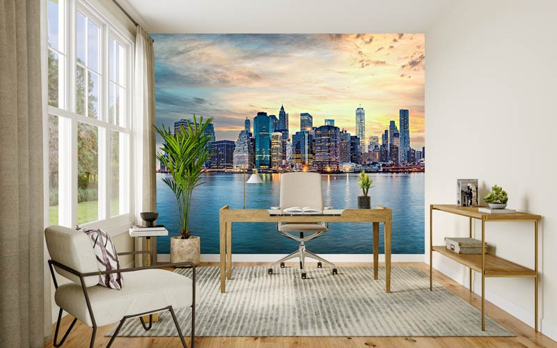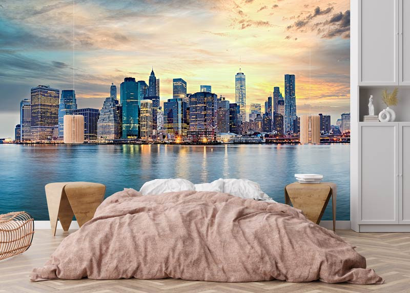 Dit fotobehang toont de indrukwekkende skyline van New York tijdens een warme zonsondergang. De lucht kleurt in zachte tinten oranje, geel en blauw, terwijl de hoge wolkenkrabbers langzaam oplichten. Het kalme water op de voorgrond zorgt voor een mooie reflectie van de stad en geeft het geheel een rustige en uitgebalanceerde uitstraling.