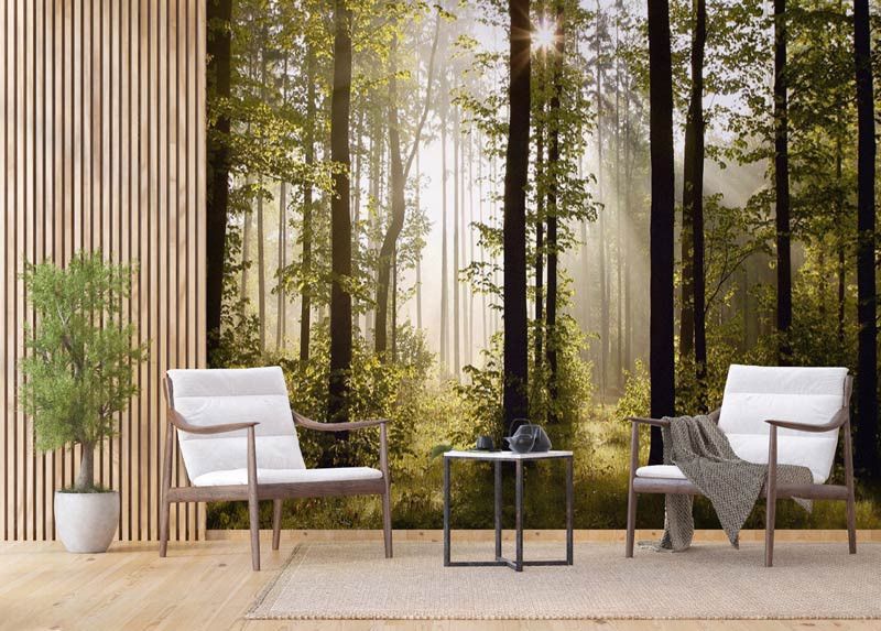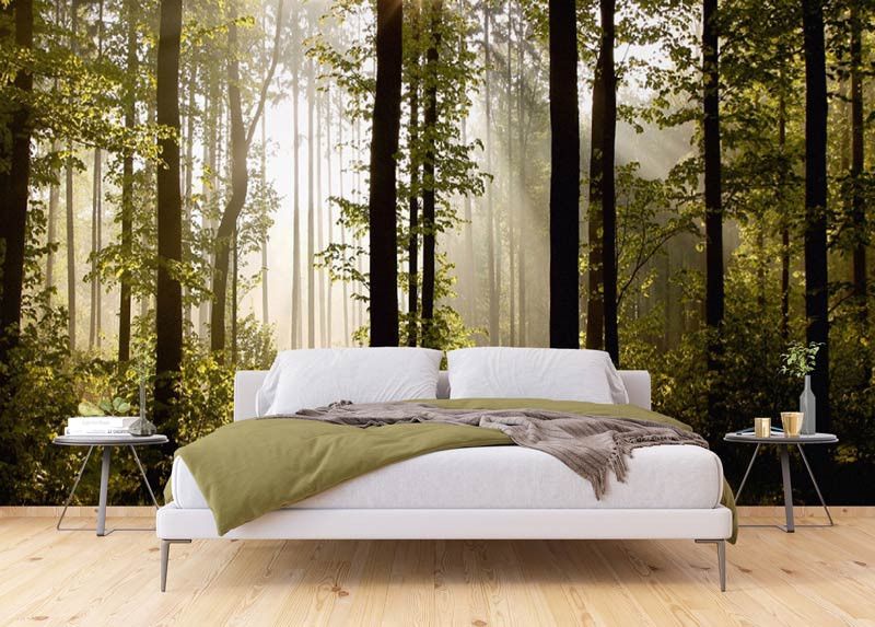Ervaar de serene schoonheid van een ochtendbos verlicht door een stralende zonsopkomst. De warme zonnestralen en levendige groene tinten brengen een natuurlijke, frisse sfeer in de ruimte. Het fotobehang biedt levendige kleuren en hoogwaardige details, waardoor elke boom en zonnestraal perfect wordt weergegeven. Dit op maat gemaakte behang is ideaal voor woonkamers en slaapkamers.