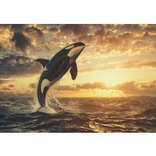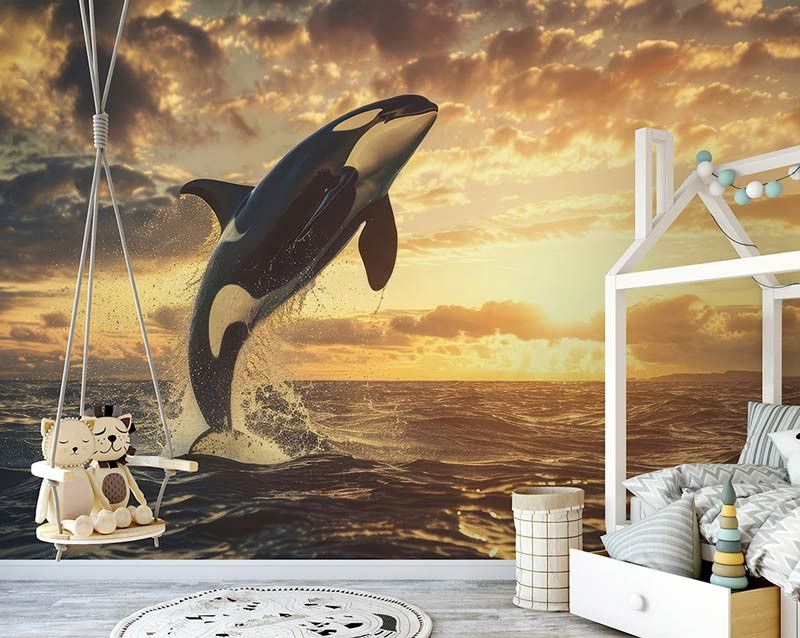 Breng de magie van de oceaan in huis met het fotobehang met een orka. Dit prachtige behang toont een imposante orka die een sierlijke sprong uit de zee maakt, precies op het moment dat de zon ondergaat. De warme kleuren van de zonsondergang in combinatie met de kracht van de orka creëren een adembenemend tafereel dat iedere ruimte een bijzondere sfeer geeft.