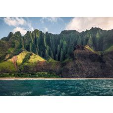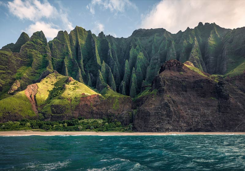 De groene bergtoppen samen met het strand zien eruit als uit een andere wereld.