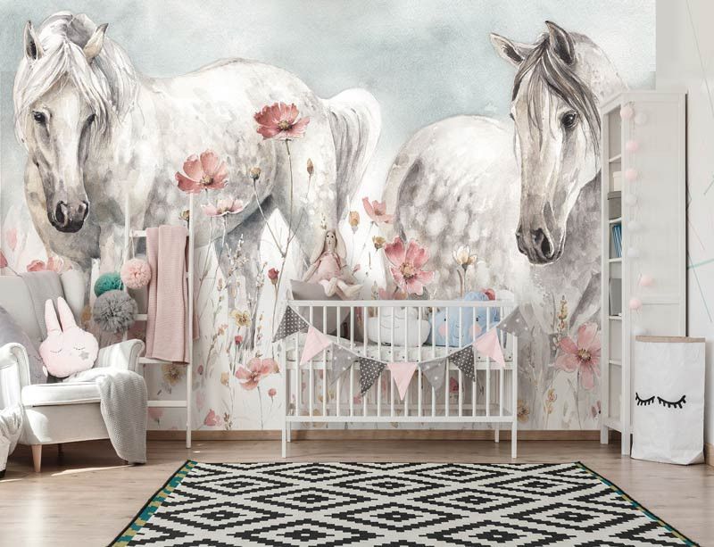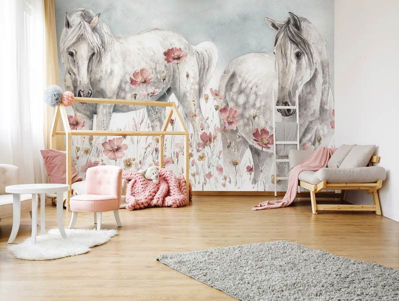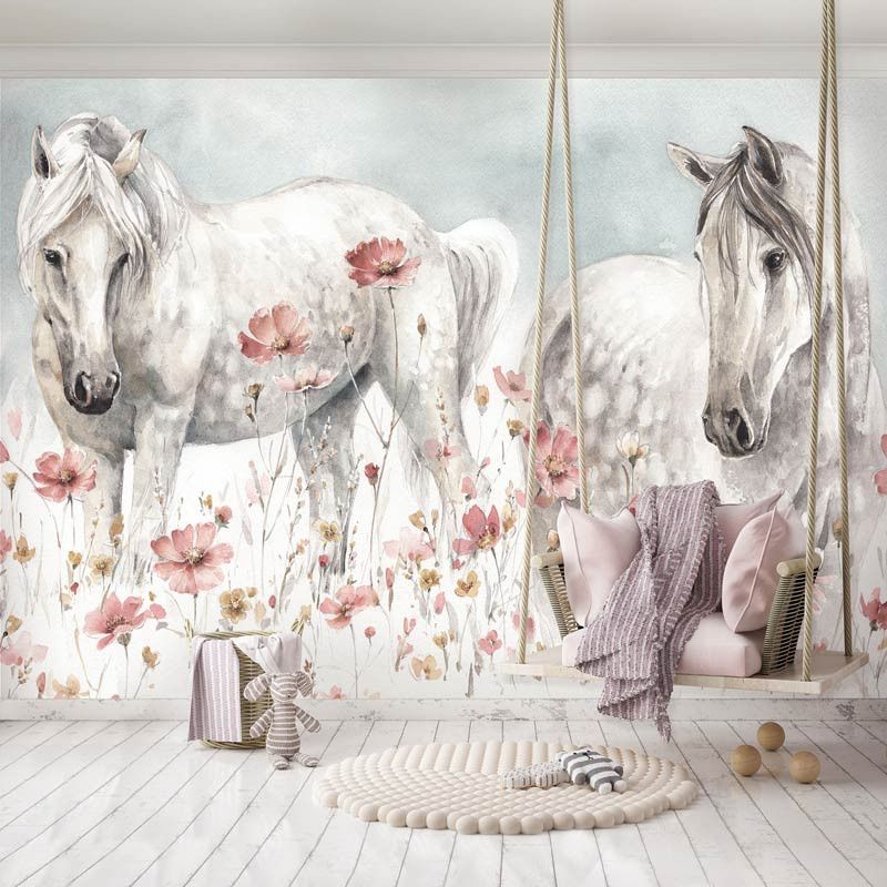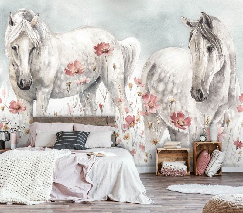 Laat de majestueuze schoonheid van paarden samenkomen met de kleurrijke pracht van bloemen in je interieur met ons Fotobehang Paarden en Bloemen. Dit betoverende fotobehang brengt een vleugje rustieke elegantie en natuurlijke charme in elke kamer.